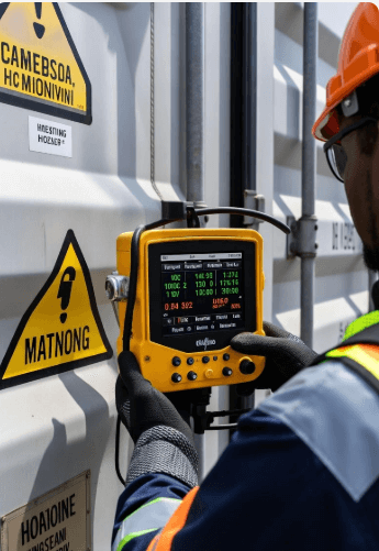 Volledige analyse van zeecontainers met controle op fumigatiemiddelen, VOS en zuurstofniveaus.