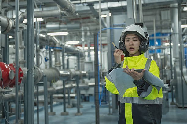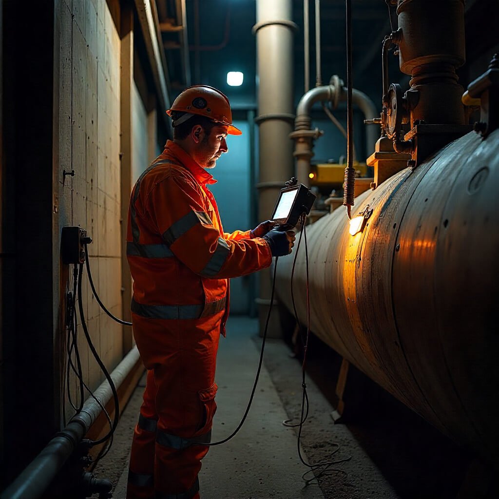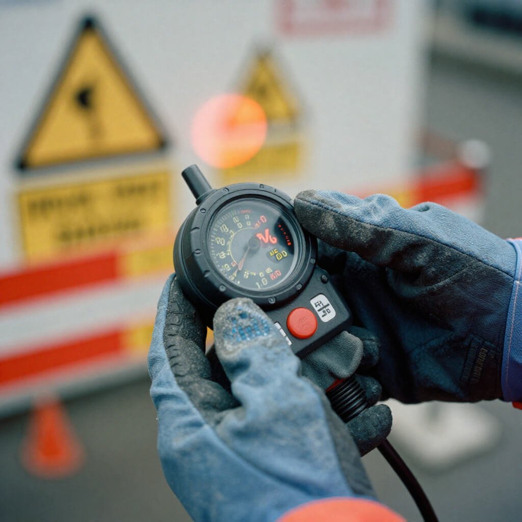 "Safety specialist in fire-resistant PPE using specialized flammable gas detection equipment in industrial facility,
