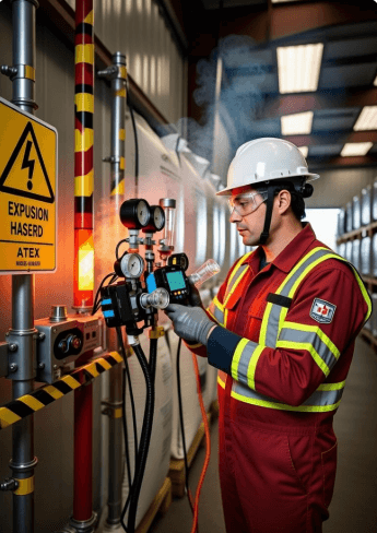 "Certified safety professional performing advanced gas inspection in industrial tank or production room, sophisticated monitoring equipment visible, heavy industrial setting with silos and technical infrastructure, professional industrial safety photography, emphasis on expert-level facility inspection and hazard assessment"